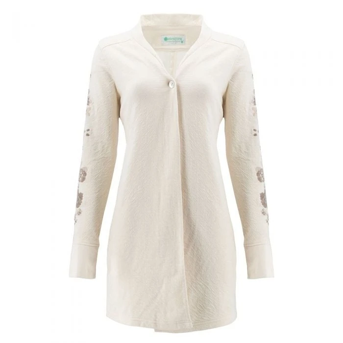 The Selena Cardigan is the epitome of ethical fashion; it is produced at a Fair Trade Certified™ factory in India and made with 100% organic cotton. Did we mention fashion? This double-knit cardigan features a collar, floral embroidery on the sleeves, single-button closure, and pockets tucked into form-flattering princess seams. Pair this cozy cardigan, which comes in three natural fall tones, with our Kaede Sweater, your favorite pair of jeans, and best fall booties.