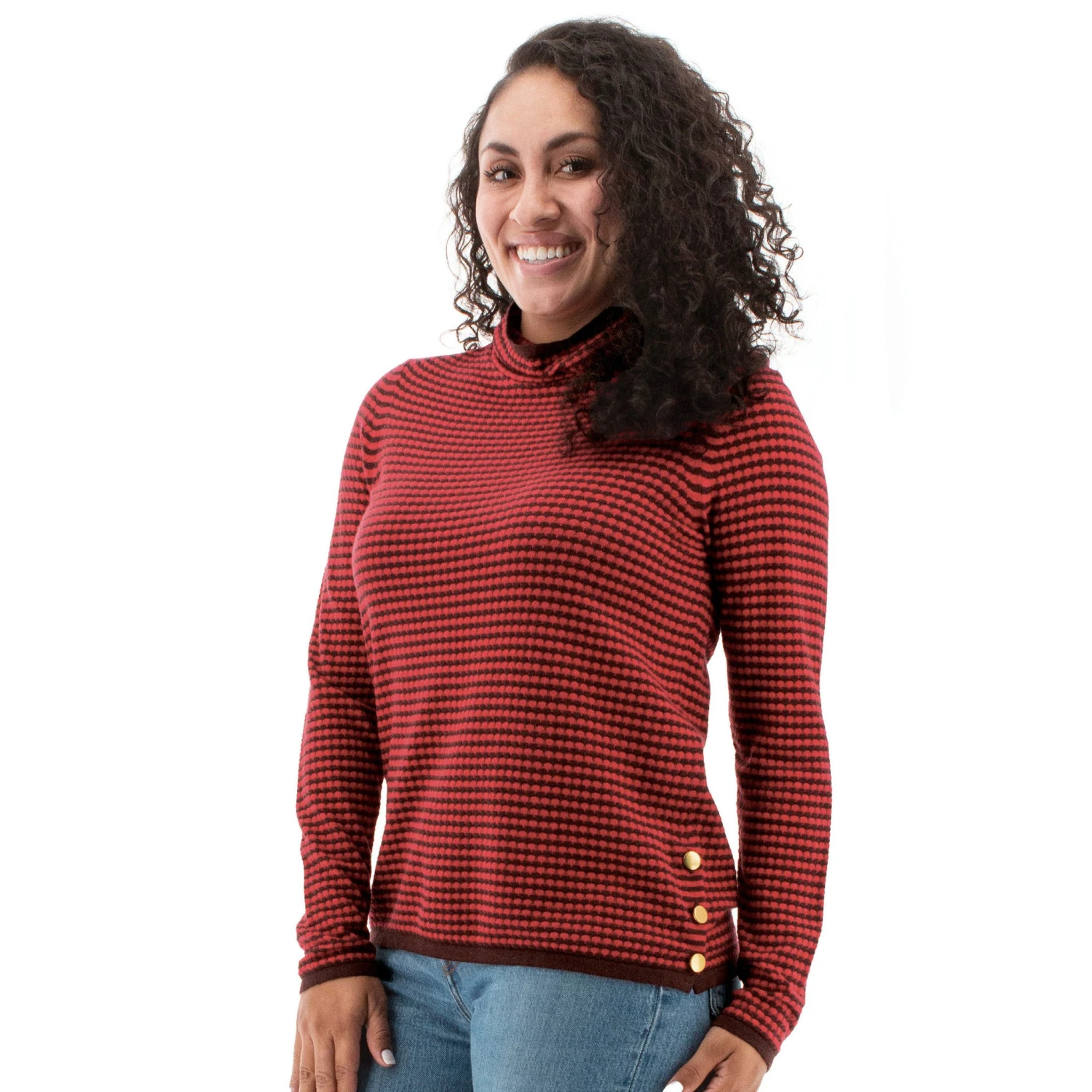 The Fair Trade Certified™ Madison Cowl Neck Top embodies the time-tested knowledge of Aventura’s women-led design team, providing you with the comfort and design our customers love the most. Organic cotton, the backbone of our company’s sustainability offerings, blends with modal fibers allowing the Madison to be lightweight as well as temperature-regulating, soft, and stretchy. We love that it mimics the style of a classic, heavyweight knit while maintaining the feel of a long-sleeve top. The cowl neck design is one of our most requested silhouettes because it is laid-back yet cozy. Further design polishes off the look, with a two-toned scalloped knit pattern, gold buttons along the side, and solid trim lining the cuffs, hem, and neck.
