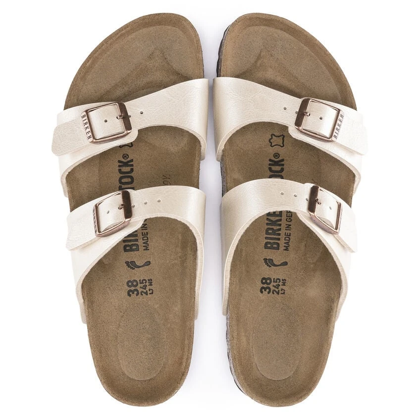 The BIRKENSTOCK Sydney has both form and function. With its two simple straps, it covers fashion and comfort. This version features silver-toned buckles and silky sheen finish. The upper is made from the skin-friendly, hard-wearing synthetic material Birko-Flor® with a silky sheen.