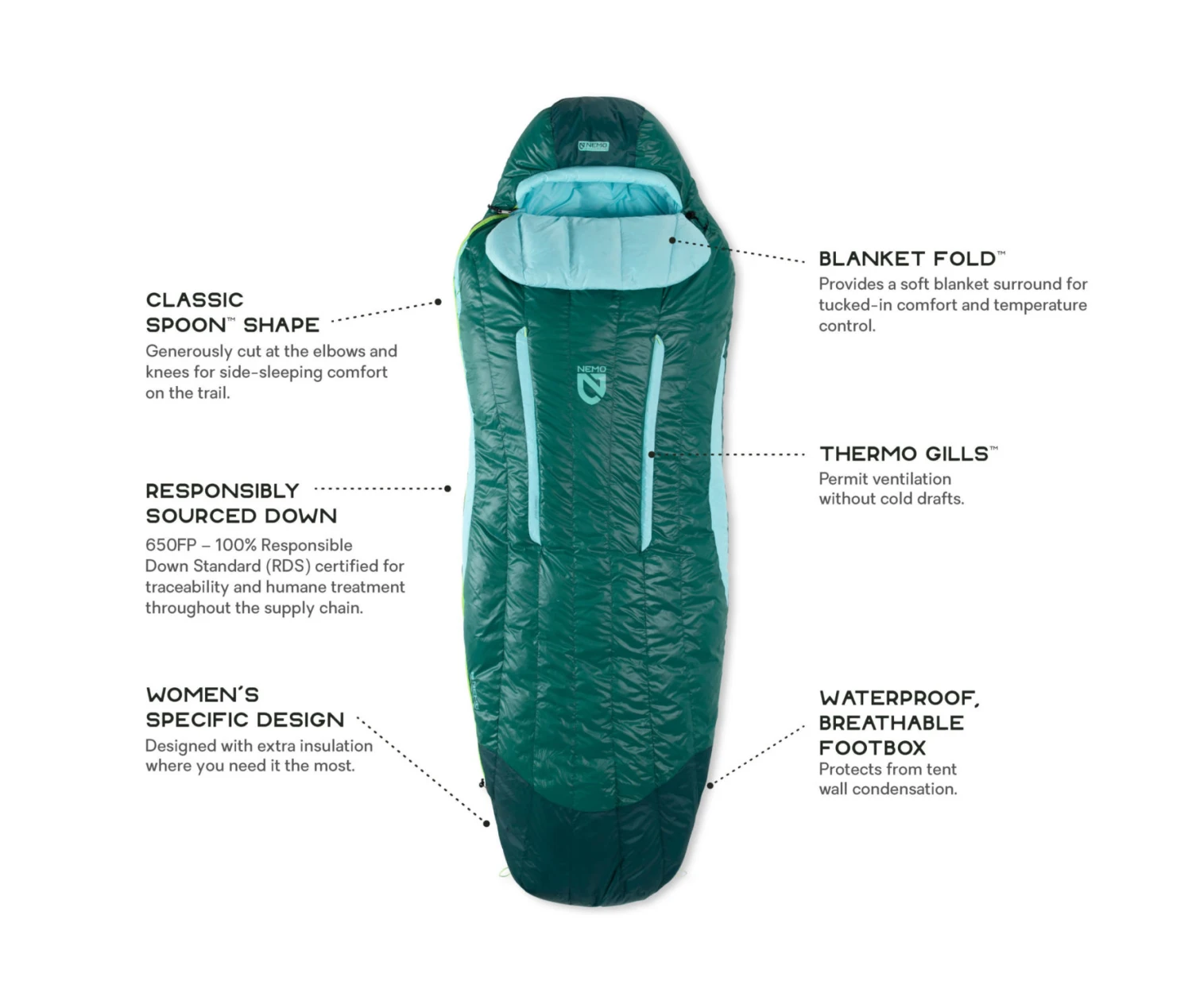 These 3-season backpacking bags are loaded with features, including Thermo Gills™ that help regulate temperature during the night, Blanket Fold™ that provides tucked-in comfort, and a waterproof/breathable footbox to withstand tent condensation. Left-sided zippers on Men’s and right-sided zippers on Women’s allow Disco™ to zip together for a double version of these favorite sleeping bags.