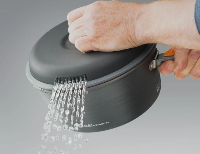 Four-person system includes: 3L pot, 2L pot, 9″ fry pan, strainer lid, four 14oz mugs with insulated sleeves and sip through lids, four 14oz bowls, four 7.5″ plates, folding pot gripper, welded storage bag/sink