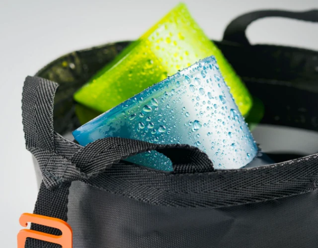 Rugged, welded storage sack holds set and doubles as sink or wash basin