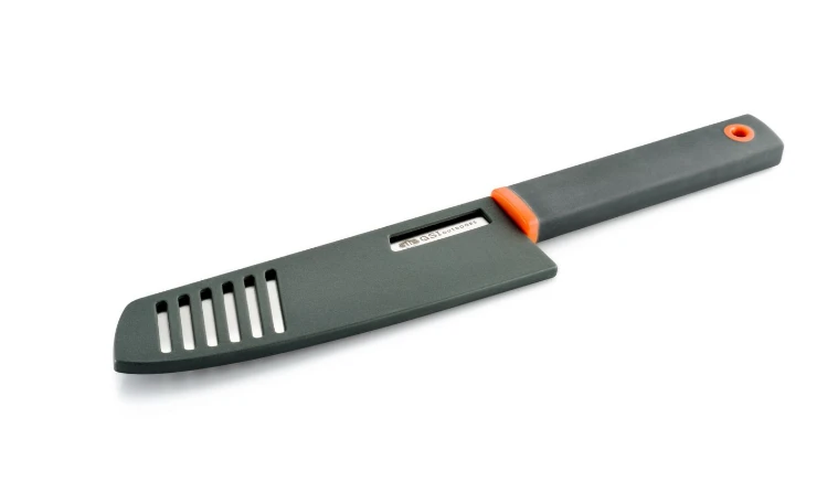 Prep your gourmet camp meals with the compact, stainless steel GSI Outdoors Santoku 6″ Chef Knife. The perfect outdoor camp prep chef tool.