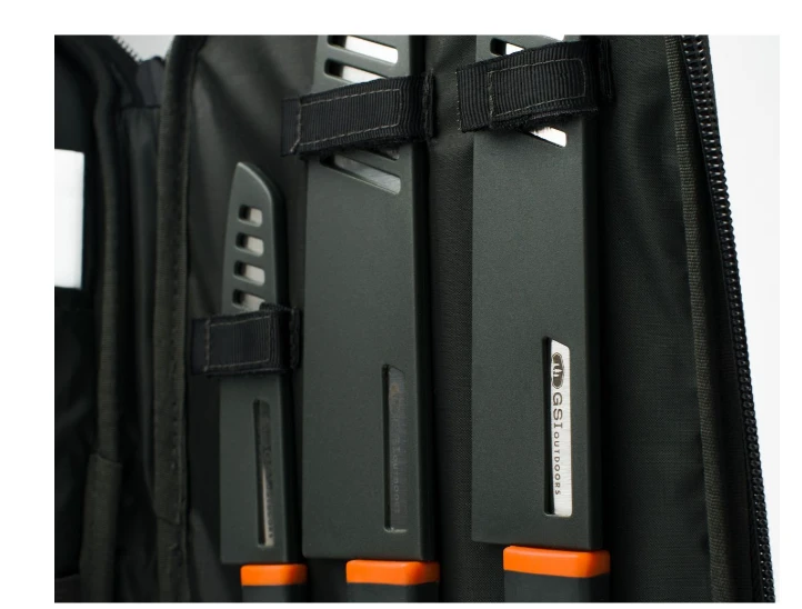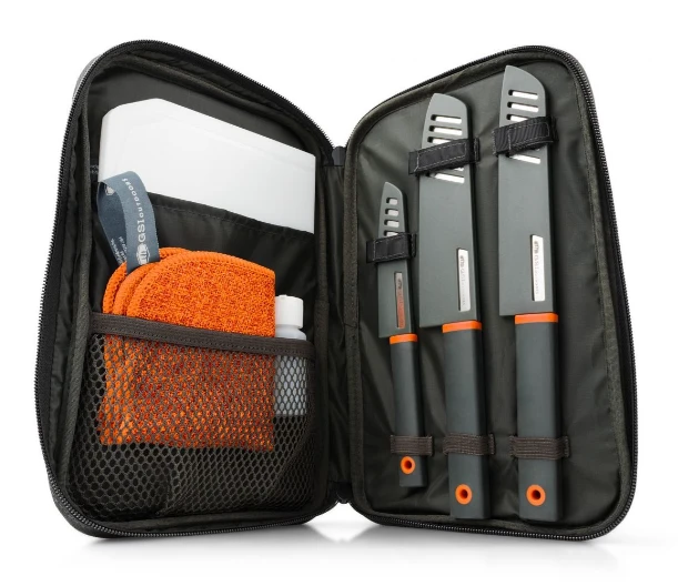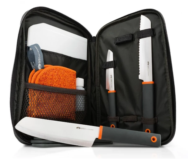 Compact, stainless steel blades are perfectly rockered for kitchen prep and any other camp use