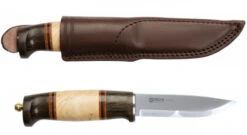 The beautiful, warm handle is made from curly birch and darkened oak separated by layers of leather. It has a full length tang. The blade is made of razor sharp triple laminated stainless steel. It comes with an embossed leather sheath with a handle butt retainer. A knife you will treasure.