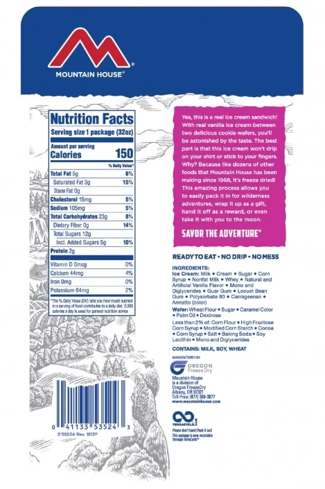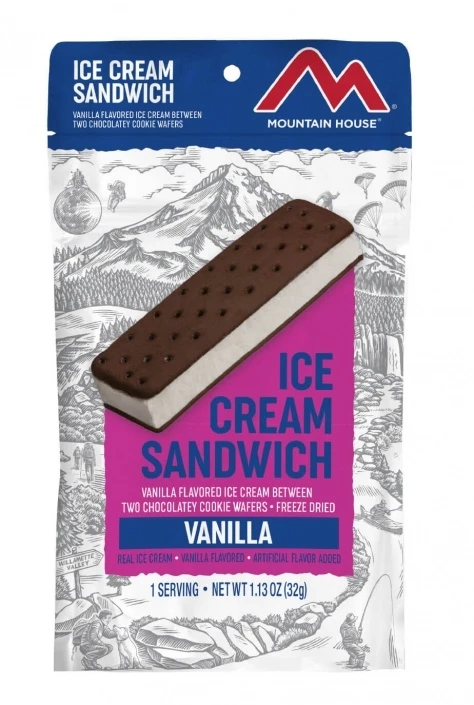 Mountain House’s Freeze-Dried Ice Cream Sandwich allows you to enjoy real ice cream without needing a freezer. Sound too good to be true? We can assure you it’s no joke – our ice cream sandwich features delicious, creamy freeze-dried vanilla ice cream sandwiched between two chocolate cookes for a delicious treat that can be enjoyed anywhere. And best of all? It’s ready to eat straight from the pouch – no water or waiting required!