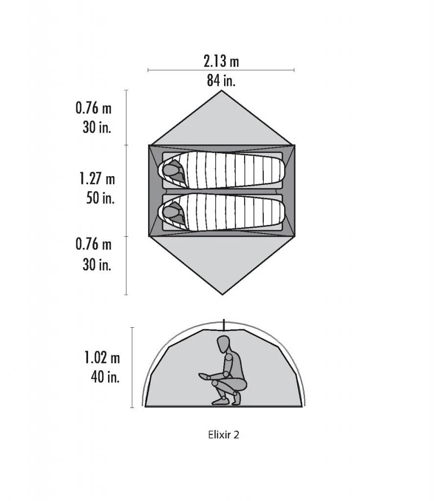 The MSR® Elixir 2 tent is an extremely livable performance camping and backpacking tent and an ideal option for adventurers seeking an easy-to-assemble tent at a great value. Unlike many tents in this class, this MSR freestanding tent design offers true-to-size capacity for two and features two large doors plus new larger vestibules with 35% more space. The versatile tent balances breathable mesh fabric with solid canopy fabric to provide ventilation, warmth and privacy, while the included footprint offers multiple setup options, including a freestanding Fast & Light pitch with rainfly. Whether you’re planning your first backpacking trip or your next one, the Elixir 2 tent is your remedy.