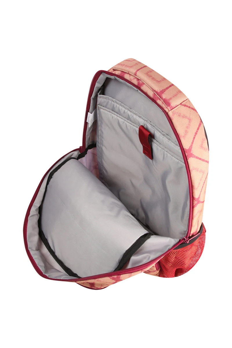 Backpack with adjustable padded shoulder straps, fixed hand strap with padded grip, padded back and bottom panel, main compartment with zip closure and interior padded laptop / tablet sleeve (up to 15″), two exterior zip pockets (one with multiple organizational pockets within and one fleece lined), two side mesh pockets.