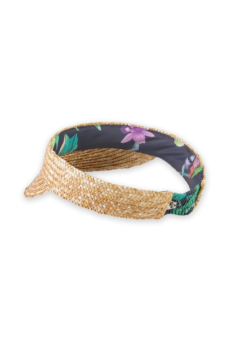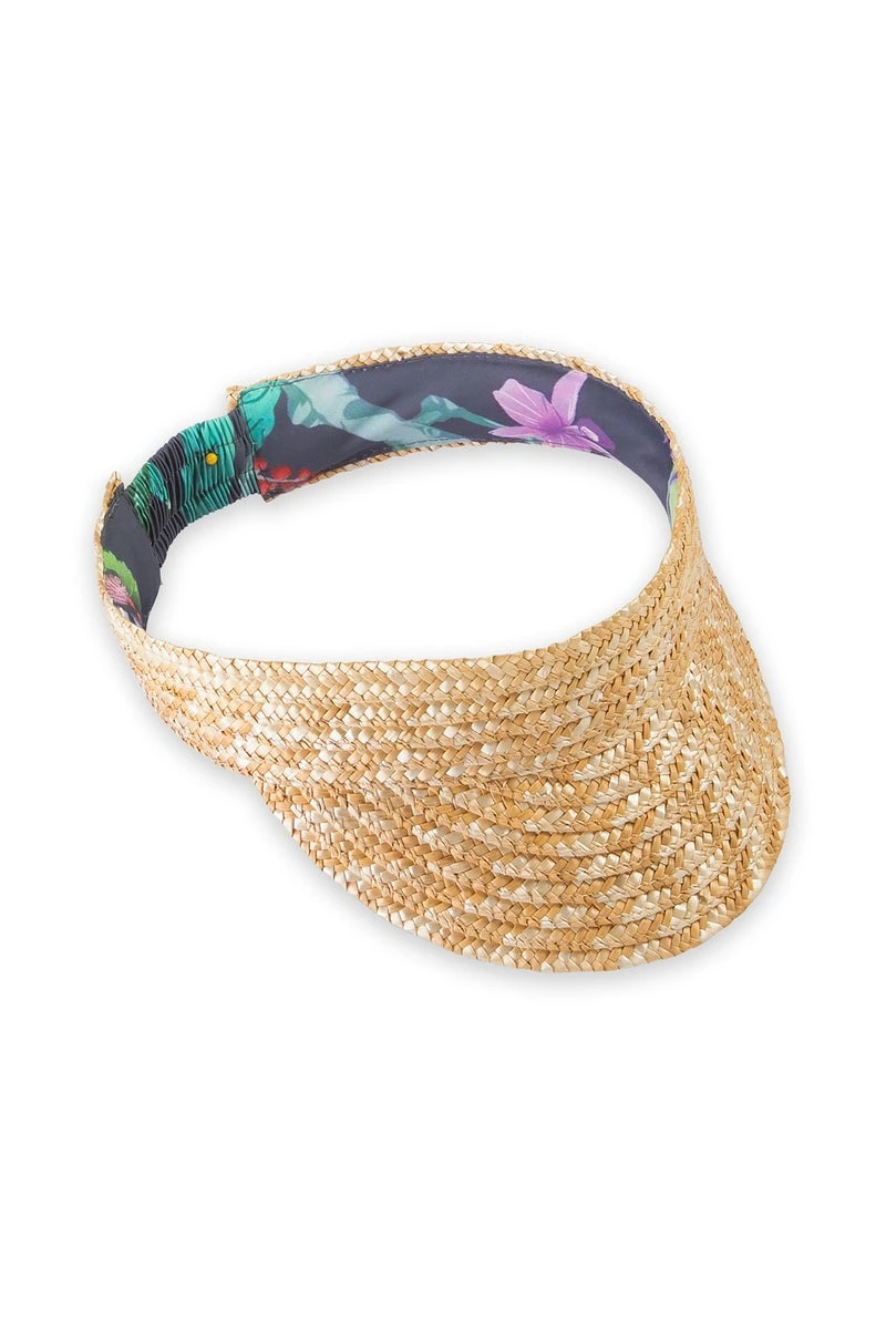Heritage vibes with 100% pipe straw exterior and fun palm print underside. The Palm Playa visor is swim up bar ready.
