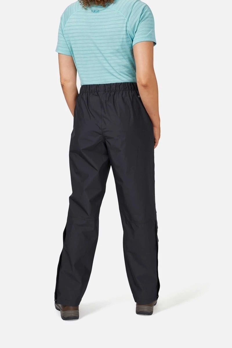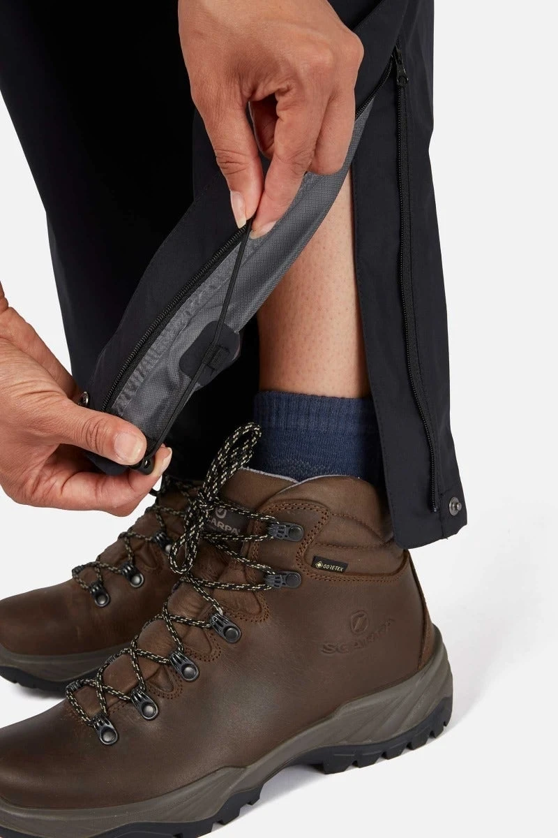 They use a polyester outer and membrane, which means that, in addition to being 100% recycled, the fabric also has the potential to be recycled at the end of its life much more easily than waterproof fabrics made from multiple polymer layers. The pants can be pulled on easily over trousers and walking boots in an unexpected shower, thanks to knee-length side zips and elasticated waistband. When temperatures rise and the pace quickens, the side zips also enable welcome ventilation.