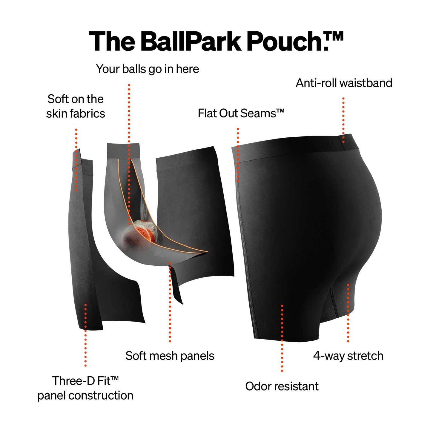BallPark Pouch™, Three-D Fit™, Flat Out Seams™.