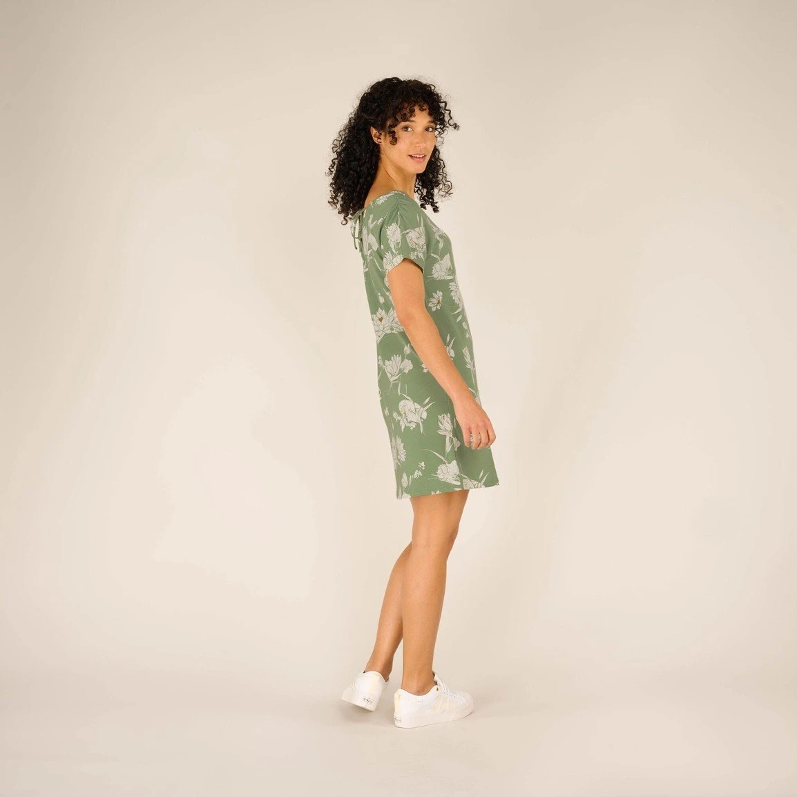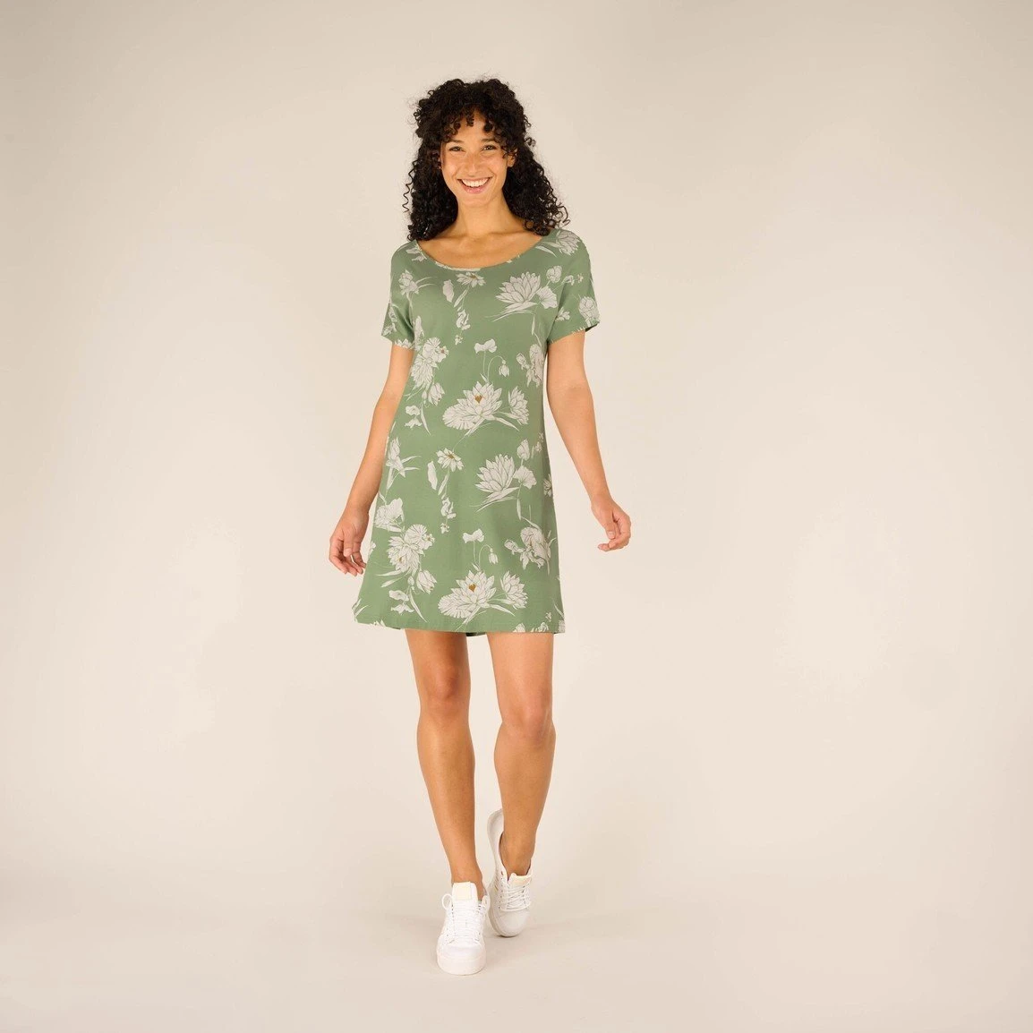 The Padma Tie Back Dress combines all the practicality of a t-shirt dress from the front, with a beautiful V-cut and tie at the nape of the neck. The design of this dress is inspired by the name, meaning ‘lotus’ in Hindi, featuring a gentle cascading lotus flower print, enhancing the flattering drape of the silhouette. The blend of organic cotton, Modal® and spandex gives the fabric a soft, comfortable feel. Subtle, elegant touches such as the small coin, embossed with Sherpa’s endless knot, draws the eye to the feminine features of this dress. Whether exploring the terrain or going out for dinner, the Padma Tie Back Dress is a versatile option, beautiful in its simplicity.