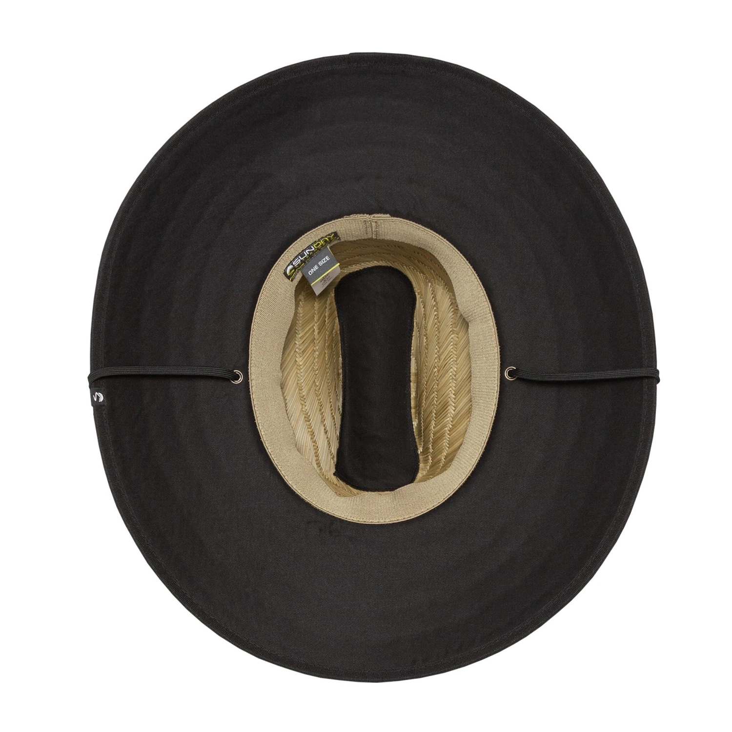 Sun worshippers beware—the Sun Guardian Hat has arrived! Made from 100% natural straw, this classic lifeguard hat has been given a serious upgrade: a UPF 50+ brim and top-of-crown liner, an elasticized sweatband for a custom fit, a dark underbrim to reduce glare, an adjustable and technical chinstrap for when the wind picks up, and custom artwork by Carlos del Rio on the crown patch for a special touch. Ideal for outdoor enthusiasts who work and play in full sun.