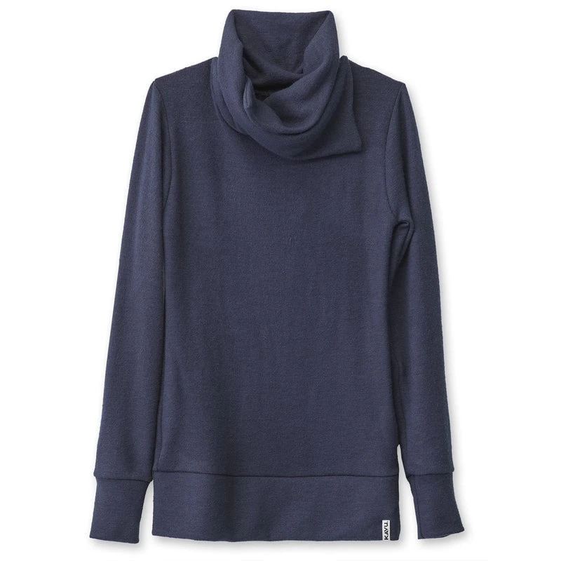 Semi-fitted, hip-length pullover sweater with unique cowl neck construction.